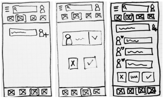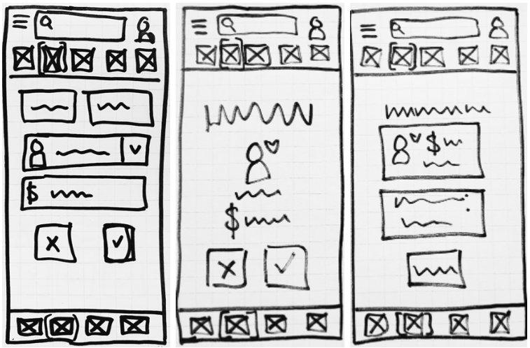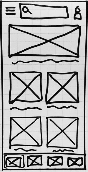 Based on my user flows, I drew low-fidelity wireframes on graphing paper. Pen and paper prototyping allowed me to make multiple versions of a screen very quickly without using lots of time or resources. From my low-fidelity wireframes, I gained a solid foundation to iterate upon, increasing the fidelity each step along the way. Due to the nature of low-fidelity prototypes, I focused on functionality first, saving the details for mid-and high- level fidelity iterations.