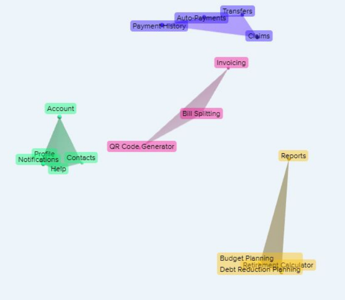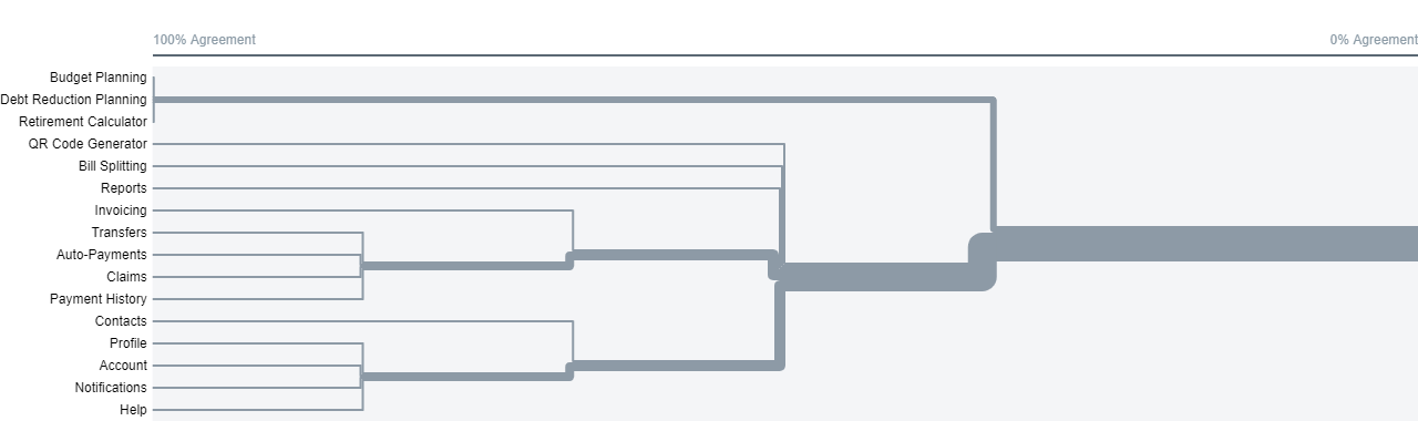 With the exception of a couple of features, the breakdown was very similar to the original sitemap. There was one feature, however, that was difficult to place. The three budgeting features (budget planning, debt reduction planning, and retirement calculator) were grouped together by participants 100% of the time. The 3D cluster view shows the reporting feature included in this group, though it is noticeably farther from the rest of the features. The dendrogram shows the reporting feature in a similar placement to the QR code generator and bill splitting features. As a result, the reporting feature could be placed in one of those two potential categories.