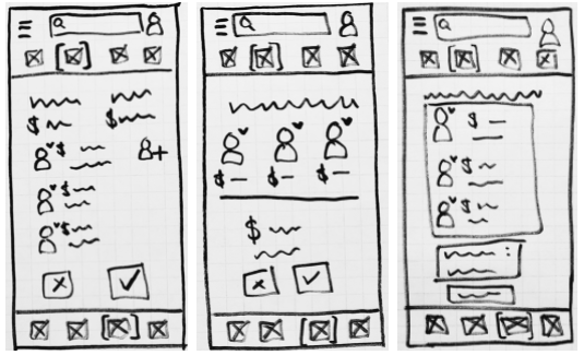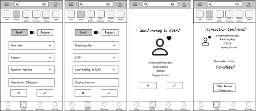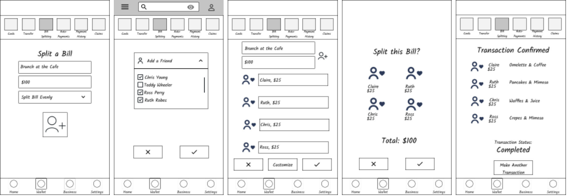 My final set of low-fidelity wireframes exemplified splitting a bill. Similar to the transfer feature, splitting a bill requires at least two inputs: another user and an amount. But this bill needs to be split among multiple users. For this reason, I chose to have the user input each individual in the group as the first step of the task. Once each member of the group is entered on the bill, the final amount is added, and the bill is ready to split. A customizable button allows users to edit each person’s portion of the bill if it shouldn’t be split evenly among the group. To stay consistent among the different features, I included a both review screen and a status screen. This matches the flow of the transfer feature and gives users an idea of what to expect each time they move money within the app.