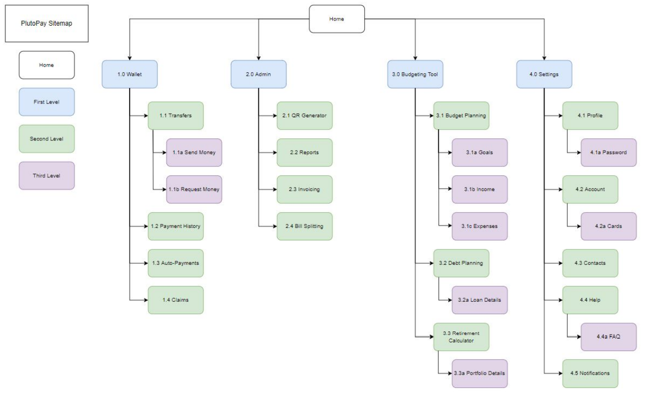 Creating a sitemap helped me to focus on the hierarchy of screens for PandaPay. I created an initial sitemap, grouping features in a way that I thought would be helpful to users. To test my initial app organization, I set up an open Card Sort for potential users to provide feedback.